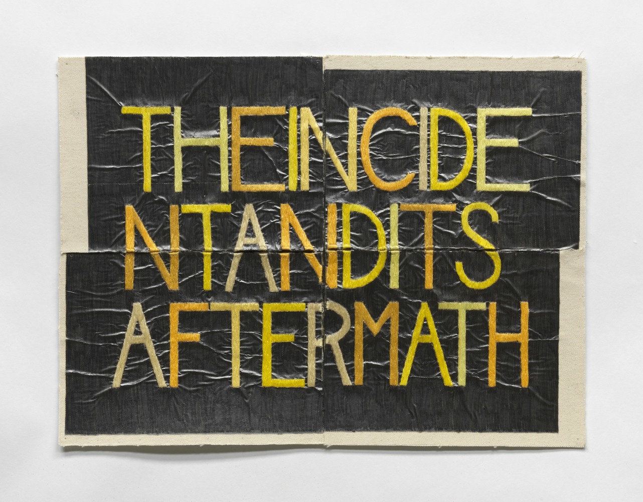 In her series “Words from Obituaries,” Frid uses short fragments she finds in selected obituaries from the New York Times . While the fragments resonate with the original source, they also stand alone as brief poems that materialize as words embroidered with vivid hues of thread on top of graphite. These poems sometimes admonish and sometimes make observations and declarations. For example, in the work titled NYT, AUG. 22, 2015, JACOB BEKENSTEIN we read “THERE IS NO RETURN.” In selecting the colors for a given piece, the artist devised an idiosyncratic color code system to loosely classify the deceased on the basis of what they are most remembered to have done in life.